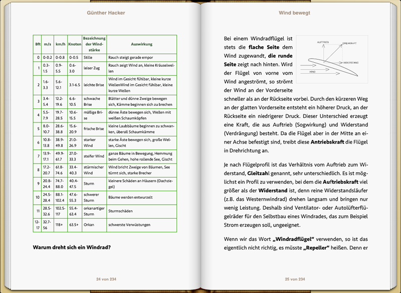 Kleine Windräder zur Stromgewinnung sind seit Jahren die Leidenschaft von Günther Hacker, einem ehemaligen Realschullehrer, der seinen sicheren Job zugunsten der Solar- und Windradentwicklung aufgegeben hat. Beim Bau kleiner Windräder musste er feststellen, dass viele Bauanleitungen und die Materialbeschaffung oftmals schwierig sind. Deshalb kam die Idee zu diesem Buch, das neben einem theoretischen Teil über die Windenergie, die Geschichte der Windräder und die Windradtypen einen ausführlichen Praxisteil enthält.