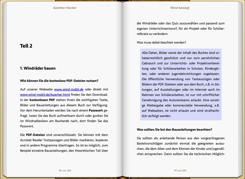 Damit der Buchinhalt mit den Bauanleitungen leichter nutzbar ist, sind die wichtigsten Teile davon als PDF-Datei zum kostenlosen Download auf der Webseite www.wind-mobil.de verfügbar. Das Passwort dazu erhalten Sie im Buch.